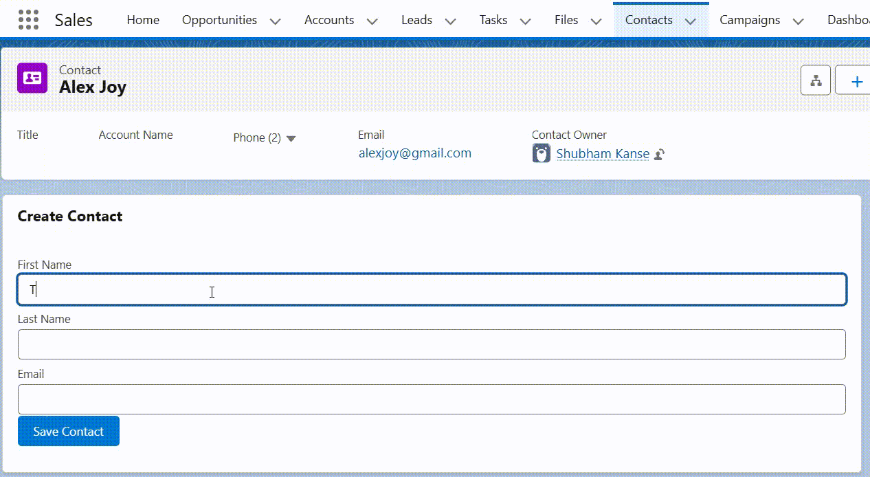 Then I checked the contact object; the record was created. But when the user clicks Save or performs any action, if the record is saved successfully, show a Success Toast with the message “Contact created successfully.”