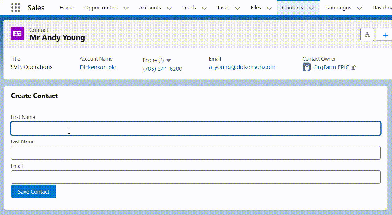 But when I enter values in the contact fields and click the Save Contact button, I don’t get any response, so I’m not sure whether the record was saved or if something went wrong.